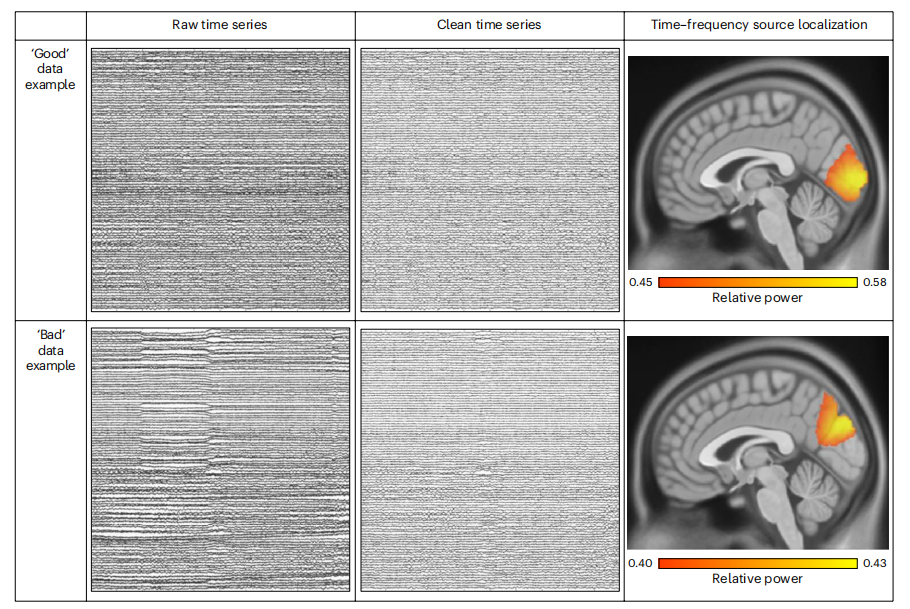 上图展示一位受试者相对无伪影的静息态数据示例,下图则展示另一位受试者存在显著伪影的静息态数据示例。从左至右依次呈现:5秒原始数据、同一段预处理数据,以及自发α波(8-12Hz)振荡的波束形成图谱。