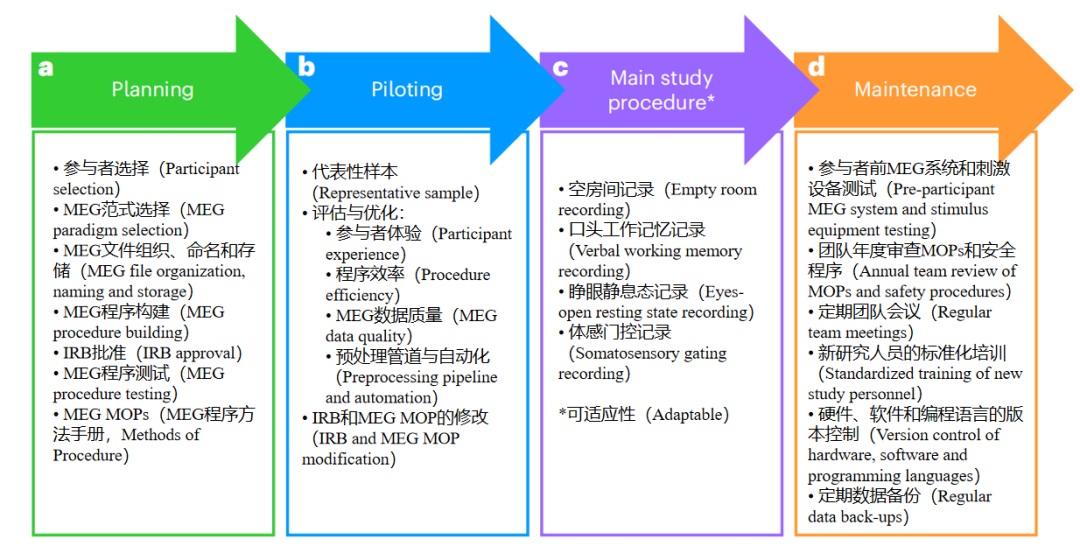 该协议包括四个阶段。a, 规划MEG程序和总体研究设置。b, 预试验完整研究(MEG及其他研究组成部分)并对MEG程序进行必要的调整。c, 主要研究期间的MEG程序实施。d, 维护与质量保证过程,以确保培训以及MEG数据采集和预处理的一致性。(翻译版,仅供参考)