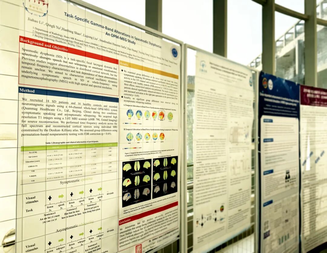 在本次会议展出的墙报中,四川大学华西医院放射学部基于昆迈医疗无液氦脑磁图系统开展的《Task-Specific Gamma-Band Alterations in Spasmodic Dysphonia: An OPM-MEG Study》(痉挛性发音困难患者中任务相关γ频段的变化:一项OPM-MEG研究),是全场唯一一项应用脑磁图技术开展研究的创新成果。